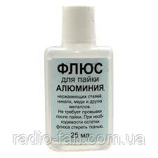 Флюс для паяння алюмінію не має в складі кислот. Постачається в флаконі об'ємом 20 мл. Флюс не викликає утворення корозійної плівки. Залишки флюса можна не видаляти, але за потреби вони легко знімаються тканиною.
